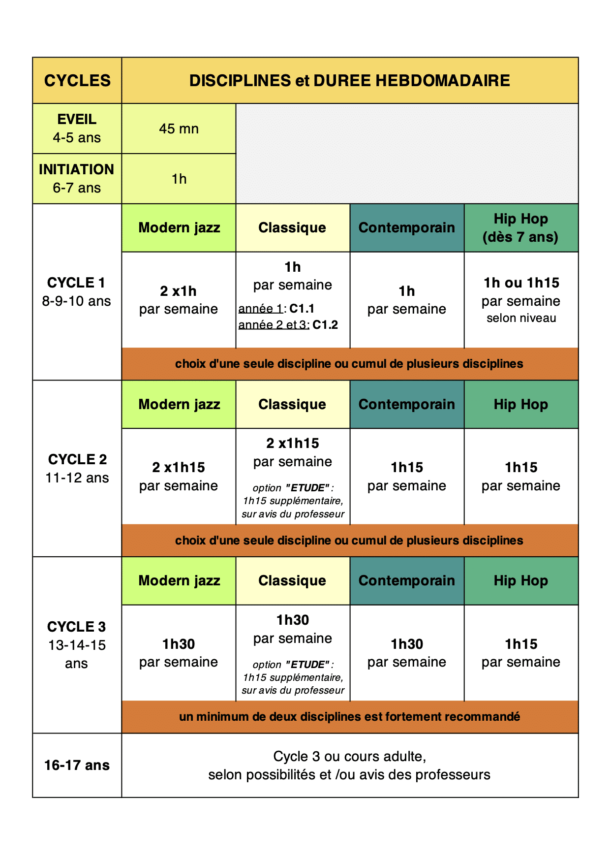 Dès la rentrée, en jazz et en danse classique, les élèves bénéficient de deux cours de danse hebdomadaires. Cela s’applique à partir du cycle 1 en jazz et dès le cycle 2 en danse classique.